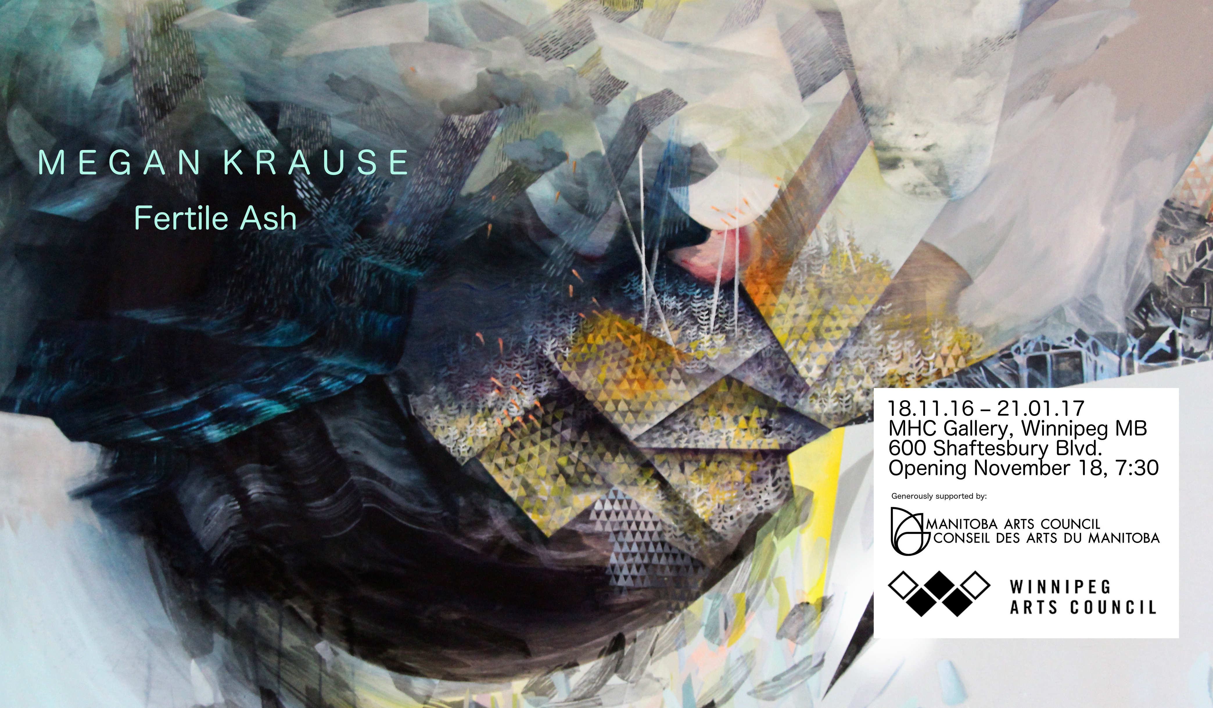 Please join me at the MHC Gallery in Winnipeg for the opening reception November 18th at 7:30. Show runs until January 21st, 2017. Thank you to Manitoba Arts Council and the Winnipeg Arts Council for your generous support.